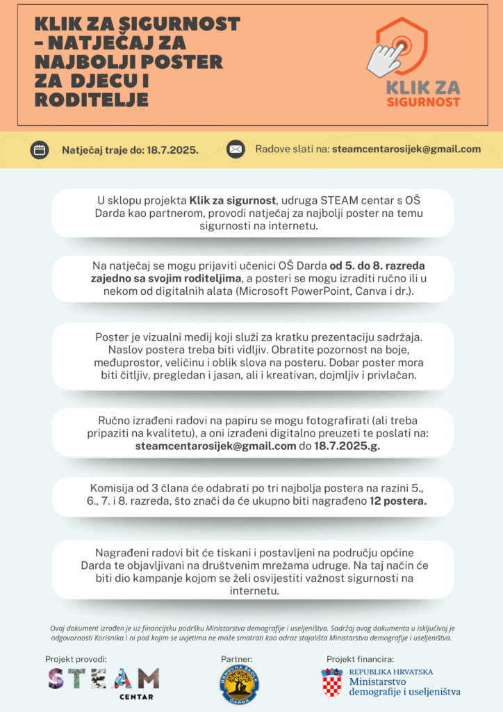 U sklopu projekta „Klik za sigurnost“, udruga STEAM centar zajedno s partnerskom školom OŠ Darda provodi natječaj za roditelje i djecu za najbolji poster na temu sigurnosti na internetu. Na natječaj se mogu prijaviti učenici od 5. do 8. razreda OŠ Darda zajedno sa svojim roditeljima, a posteri se mogu izraditi ručno ili u nekom od digitalnih alata (Microsoft PowerPoint, Canva, i dr.).