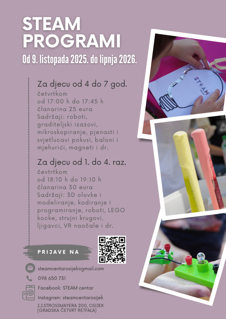 područja STEAM-a na zabavan i njima prilagođen način, kroz aktivnosti koje se međusobno nadopunjuju, a sadržaji svakog područja međusobno integriraju u zanimljive teme. Svaka od ponuđenih tema nudi razvoj brojnih znanja i vještina poput kreativnosti, mašte, znanstvenog i logičko-matematičkog mišljenja, kritičkog promišljanja, vještina rješavanja problema, vještine propitkivanja i donošenja samostalnih zaključaka, inženjersko- dizajnerskog razmišljanja te digitalnih kompetencija i kompetencija povezanih s uporabom različitih tehnologija. Djeca će kroz program učiti kroz vlastito iskustvo, provedbu različitih pokusa te kroz rješavanje stvarnih problema i povezivanje aktivnosti sa svakodnevnim životom. Također će kroz rad na zajedničkim zadacima surađivati i razvijati komunikacijske vještine. Kroz program će se susresti i s različitim materijalima, sredstvima i pomagalima za rad poput: setova za provedbu različitih pokusa, robotima, pomagalima za mjerenje mikroskopiranje, setovima za konstruiranje i građenje, strujnim krugovima, različitim senzorima, oni stariji i s 3D olovkama i pisačem, VR naočalama, tabletima i računalima na kojima će programirati i sl. Neki od ponuđenih sadržaja za mlađi uzrast su: roboti, graditeljski izazovi, mikroskopiranje, pjenasti i svjetlucavi pokusi, baloni i mjehurići, magneti i drugo. Sadržaji za stariji uzrast: 3D olovke i modeliranje, kodiranje i programiranje, roboti, LEGO kocke, strujni krugovi, ljigavci, VR naočale i drugo. Program za djecu od 4 do 6 godina odvija se od 17:00 h do 17:45 h, a program za djecu od 6 do 10 godina od 18:10 h do 19:10 h. Kao što naziv kaže, programi se odvijaju svaki četvrtak u Gradskoj četvrti Retfala (Strossmayerova 200). Mjesečna članarina za program namijenjen djeci mlađeg uzrasta iznosi 25 eura, a članarina za program namijenjen starijem uzrastu 30 eura. Rad se provodi u malim grupama te je broj djece koja mogu sudjelovati ograničen. Programi traju od listopada 2025. do lipnja 2026. godine. Prijaviti se za sudjelovanje možete tijekom cijelog trajanja programa na poveznicu: https://forms.gle/mXFvLDW8Q5VozWwL8 ili skeniranjem QR koda sa slike, jer se sadržaji mogu pratiti i prilikom naknadnog uključivanja. Za sve detaljnije informacije o uključenju djece u program možete nam se obratiti putem e- pošte info@steam-centar.hr ili putem društvenih mreža.